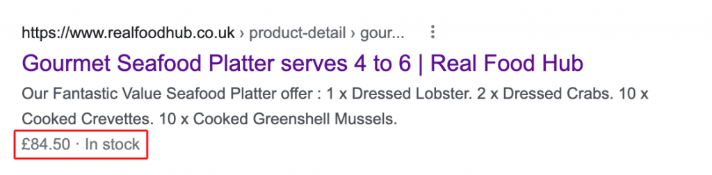 Hilighted in red is the Rich content, in this case it shows the price of the product and showcases that the product is “In Stock”