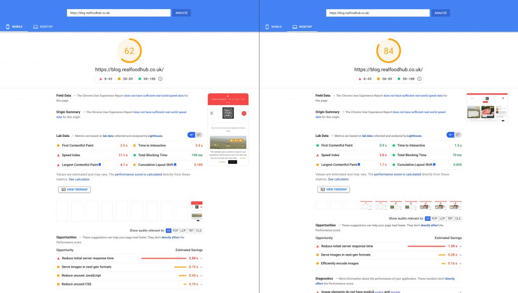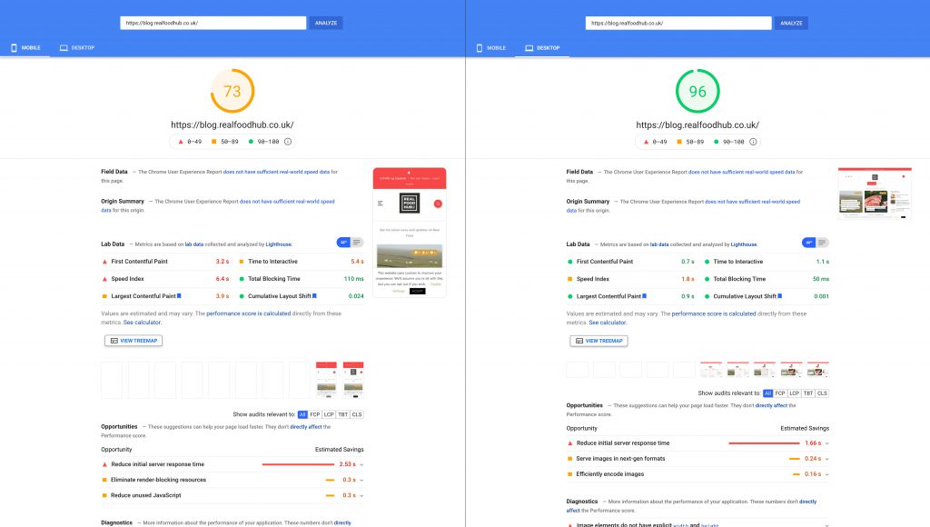 Our takeaways are that 98 is a brilliant score for the Desktop view and 81 is very good for the Mobile view. The main point is that the Largest Contentful Paint loads in 3 seconds on mobile.